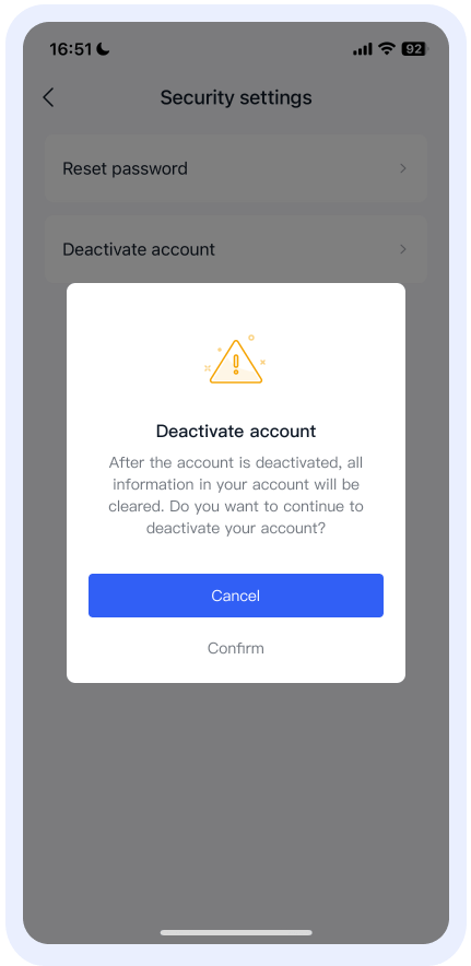 在「安全設置」頁面,點擊註銷賬號按鈕